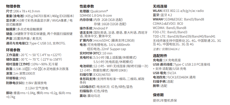 EDA61K支持Wi-Fi IEEE 802.11a/b/g/n/ac 、藍(lán)牙4.2以及全網(wǎng)通無(wú)線廣域網(wǎng)通信,保證所有網(wǎng)絡(luò)技術(shù)的高速度數(shù)據(jù)傳輸及高保真聲音支持。