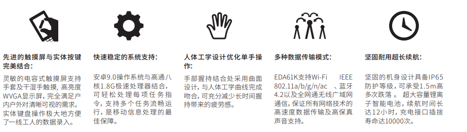 EDA61K是一款綜合性能高、應(yīng)用領(lǐng)域廣、性價(jià)比高的新一代安卓產(chǎn)品,采用安卓9.0系統(tǒng),專業(yè)的系 統(tǒng)優(yōu)化設(shè)計(jì)讓無(wú)關(guān)程序零占用,穩(wěn)定高效,徹底解決安卓系統(tǒng)內(nèi)存消耗大的問(wèn)題,同時(shí)搭載新平 臺(tái)的八核1.8G極速處理器,可輕松處理每項(xiàng)任務(wù)指令,支持多個(gè)任務(wù)流暢運(yùn)行,是移動(dòng)信息處理的 保障,可幫助客戶提高業(yè)務(wù)敏捷度并降低總體成本。產(chǎn)品高度重視用戶體驗(yàn),以對(duì)掃描具有 高速移動(dòng)性需求的倉(cāng)儲(chǔ)、物流等行業(yè)的一線員工為目標(biāo)用戶。EDA61K配備6800mAh超大容量鋰 離子智能電池保證產(chǎn)品擁有長(zhǎng)達(dá)12小時(shí)的續(xù)航,此外充電接口插拔壽命多達(dá)10000次,產(chǎn)品具有 更好的耐用性。EDA61K支持多種數(shù)據(jù)傳輸模式,保證所有網(wǎng)絡(luò)技術(shù)的高速度數(shù)據(jù)傳輸及高保真聲 音支持。