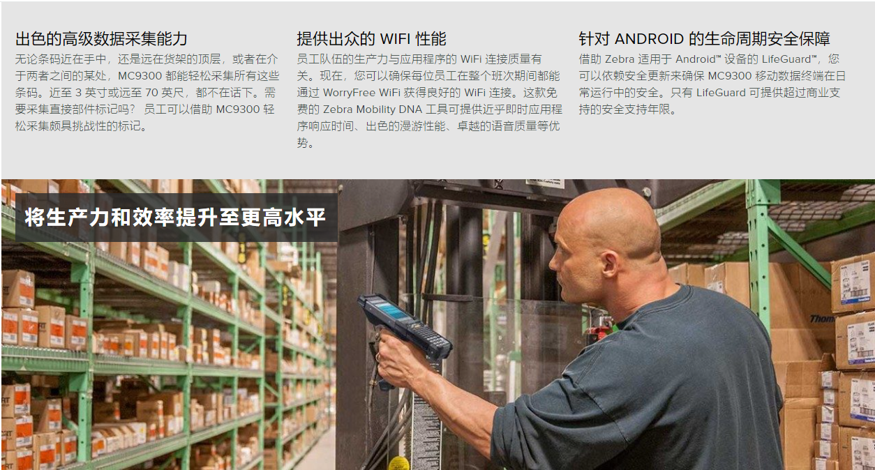 每天,超過三百萬的工人使用MC9000系列移動計算機來簡化世界各地倉庫和制造工廠中的流程。但是現(xiàn)在您需要每天處理和發(fā)送更多訂單,而且比以往更快。MC9300推出了可以實現(xiàn)這一目標的移動計算機,它是世界上暢銷,受信任的企業(yè)級移動計算機的下一步發(fā)展。借助Android,您的員工已經熟知的操作系統(tǒng),更大的高級觸摸屏等,您的員工將獲得終極的簡化。以終極的處理能力和內存處理所有應用程序。新的數(shù)據捕獲功能包括可選的前后攝像頭,非凡的掃描范圍和出色的直接零件標記(DPM)捕獲。一次充電后,新電池的使用壽命是MC9200的兩倍。它是有史以來堅固的MC9000系列,可以在任何環(huán)境下(包括冷凍機)幾乎與同類產品中的所有設備相比,具有更長的使用壽命。新的Mobility DNA解決方案使設備,操作系統(tǒng)安全性和電池管理變得容易,同時提供了前所未有的強大無線連接。而且,由于您可以開箱即用地運行現(xiàn)有的TE應用程序,因此遷移到Android并非易事。