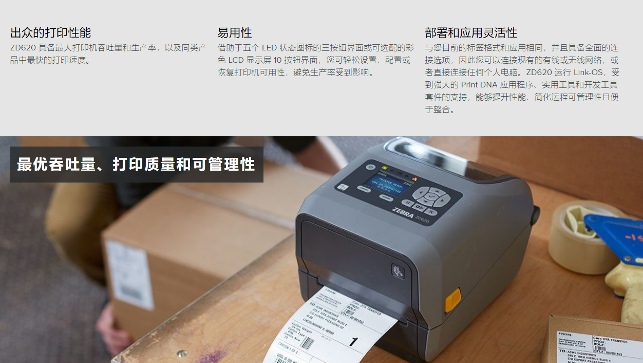 ZD620 提供出眾的打印質(zhì)量、生產(chǎn)率、應(yīng)用靈活性和管理簡便性,滿足您的所需。這款高端桌面熱敏打印機外形緊湊,提供先進的工業(yè)打印質(zhì)量,并擁有同類產(chǎn)品中更快的速度和更好的質(zhì)量。